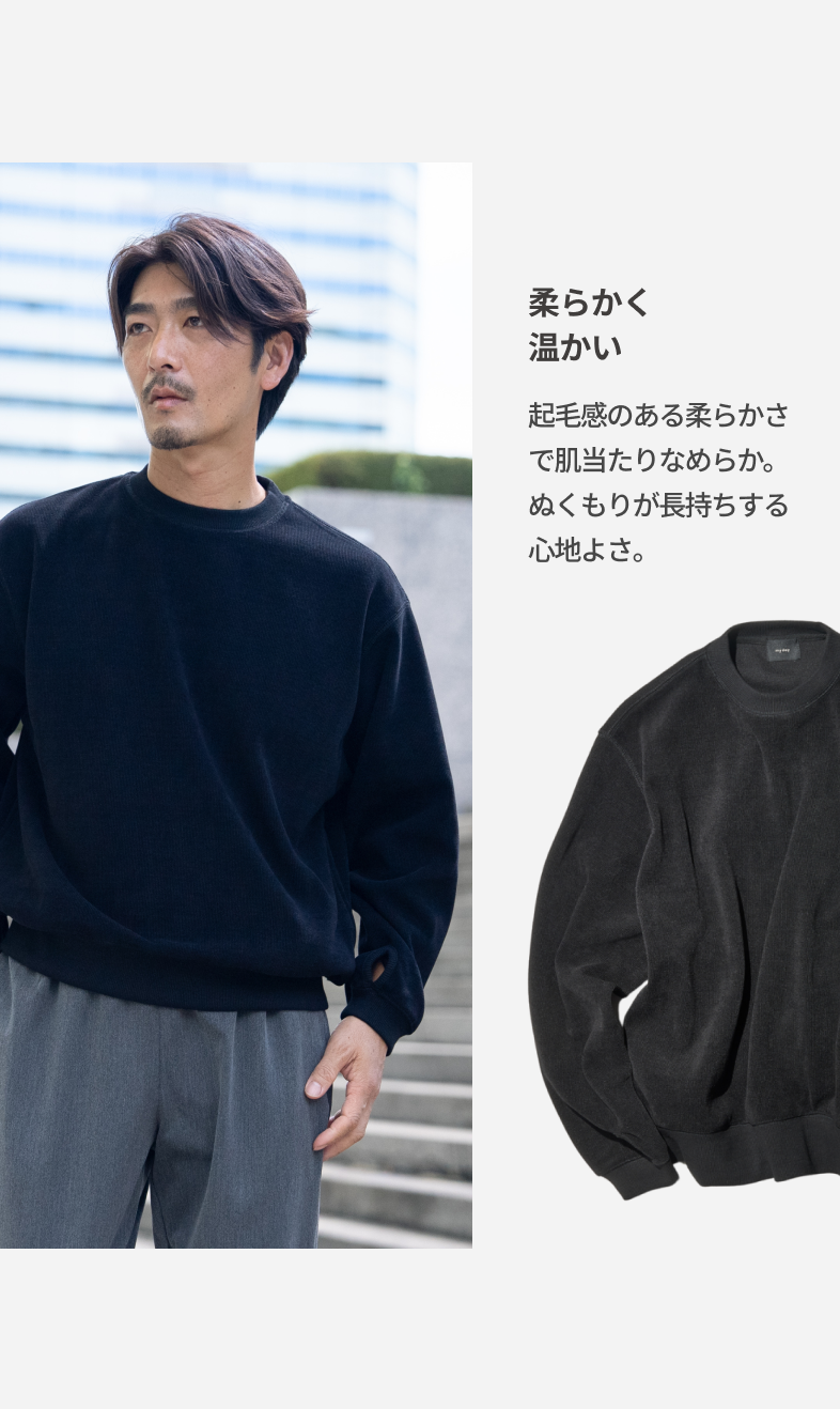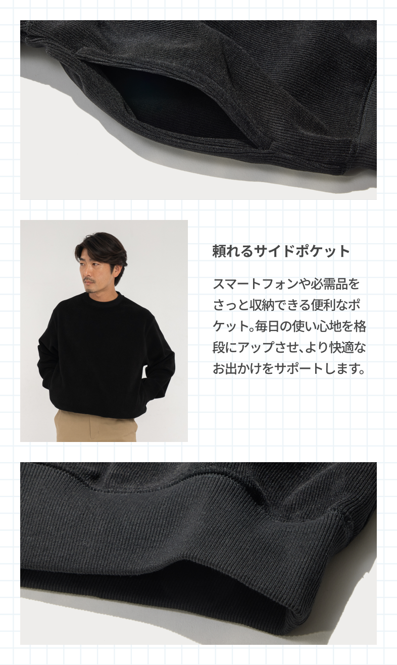 スウェットならではの楽な着心地はそのままに、一枚で着てもラフすぎず品のある着こなしを叶えます。