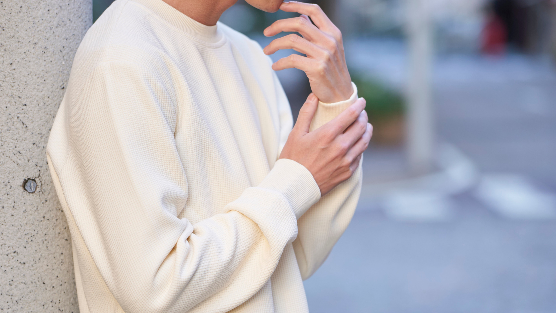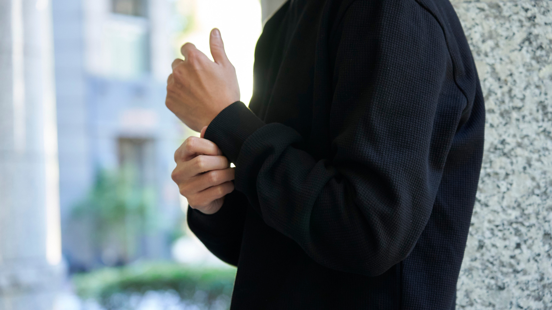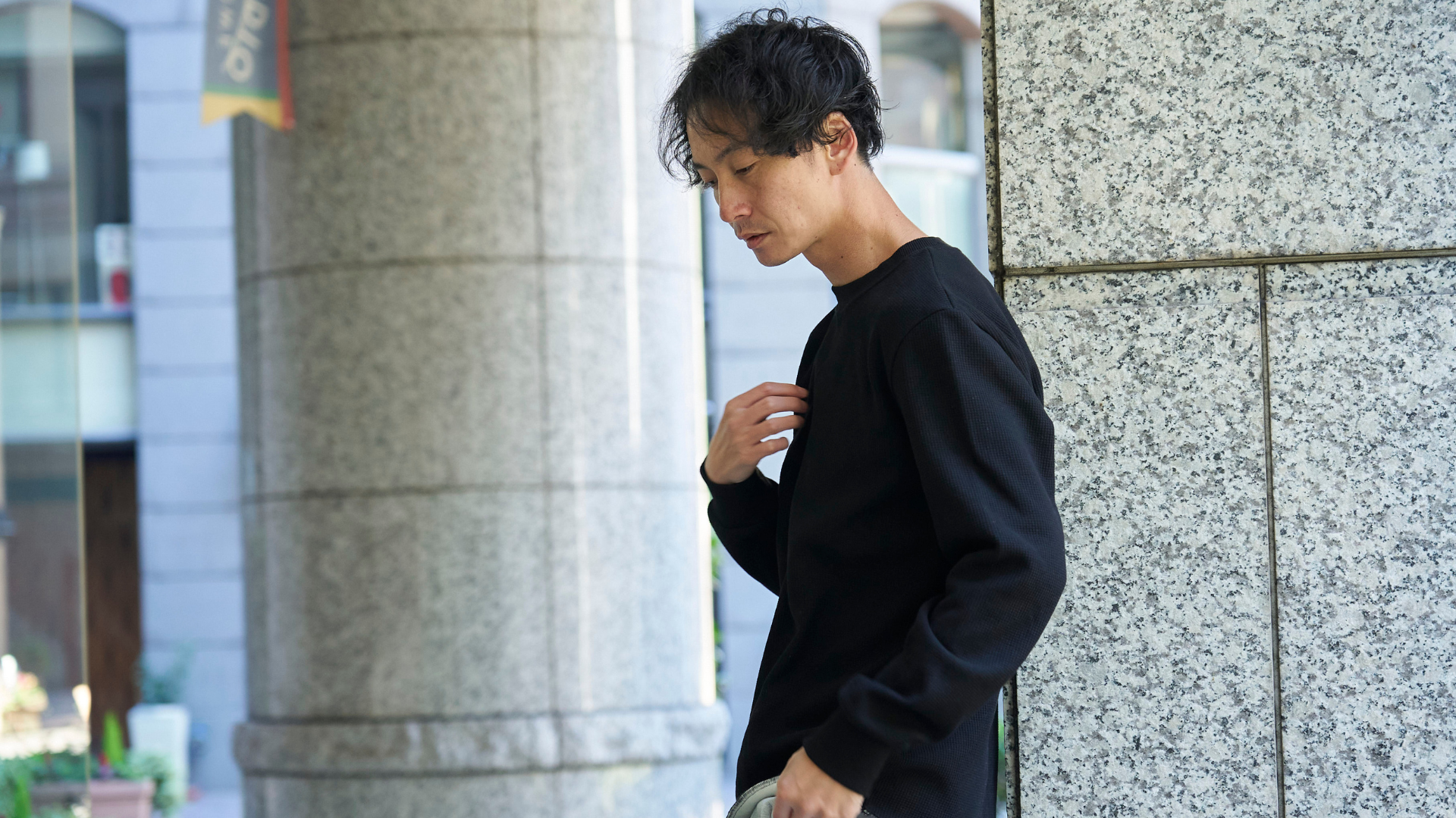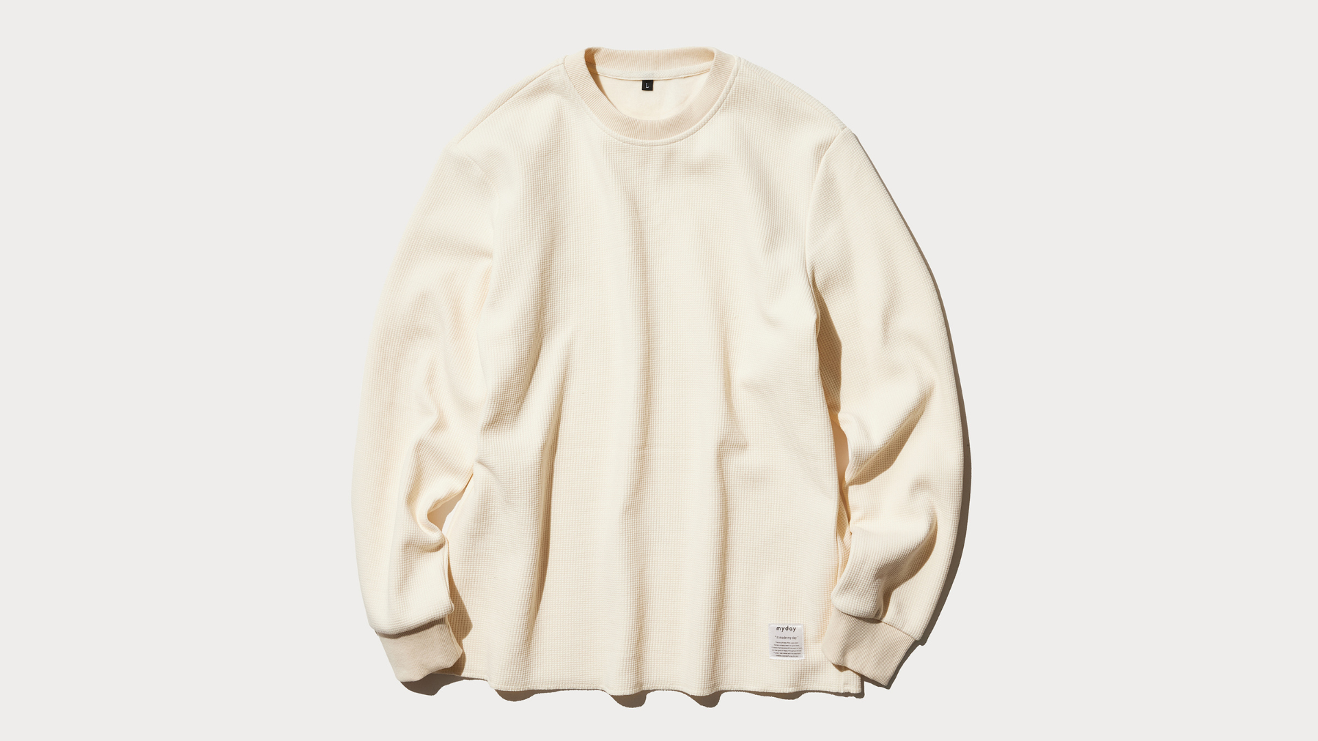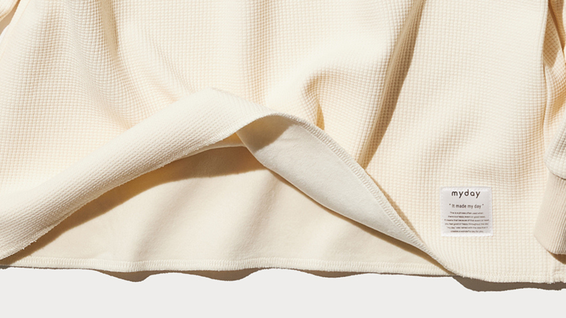 凸凹の編み目が特徴のワッフル生地を使用したサーマルカットソーをつくりました。通常のカットソーよりも熱を逃しにくく保温性の高い素材ですが、内側にベルベット素材を使用することで、暖かさがさらにアップしました。